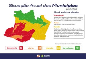 A Defesa Civil do Amazonas divulgou nesta segunda-feira (27) que 16 municípios do estado estão em situação de emergência por causa da cheia dos rios. Ao todo, cerca de 133 mil pessoas já sofreram impactos das inundações em diferentes regiões.