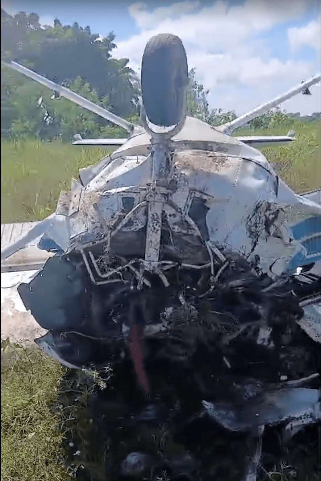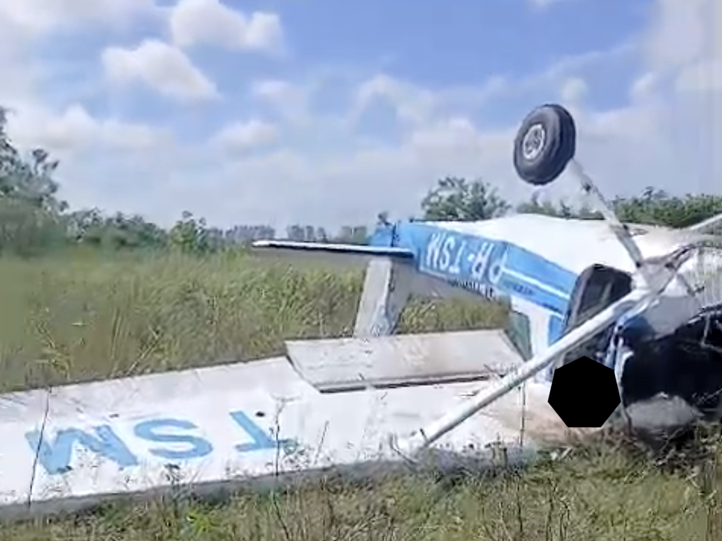 Vídeos do local do acidente mostram o monomotor com a frente destruída e capotado em uma área de gramado do aeroclube.