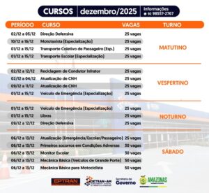 O Departamento Estadual de Trânsito do Amazonas (Detran-AM), por meio da Escola Pública de Trânsito (Eptran), abriu inscrições para cursos gratuitos em dezembro, com 460 vagas nos turnos da manhã, tarde, noite e aos sábados.