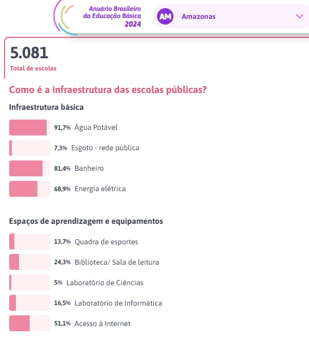 O Amazonas tem 5.081 escolas públicas de educação básica, das quais 49% não têm acesso à internet e 83,5% não têm sequer laboratório de informática. Essa é a constatação do Anuário da Educação 2024, que reúne dados públicos sobre educação brasileira do Instituto Brasileiro de Geografia e Estatística (IBGE) e do Ministério da Educação, além de análises das informações.