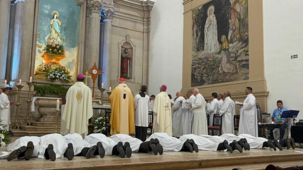 A Arquidiocese de Manaus realizou, na manhã deste sábado, 29 de novembro, a solene celebração de Ordenação Diaconal na Catedral Metropolitana Nossa Senhora da Conceição. A cerimônia foi presidida pelo arcebispo de Manaus, cardeal Leonardo Steiner, que, pela oração consecratória e imposição das mãos, ordenou novos diáconos permanentes para o serviço da Igreja.