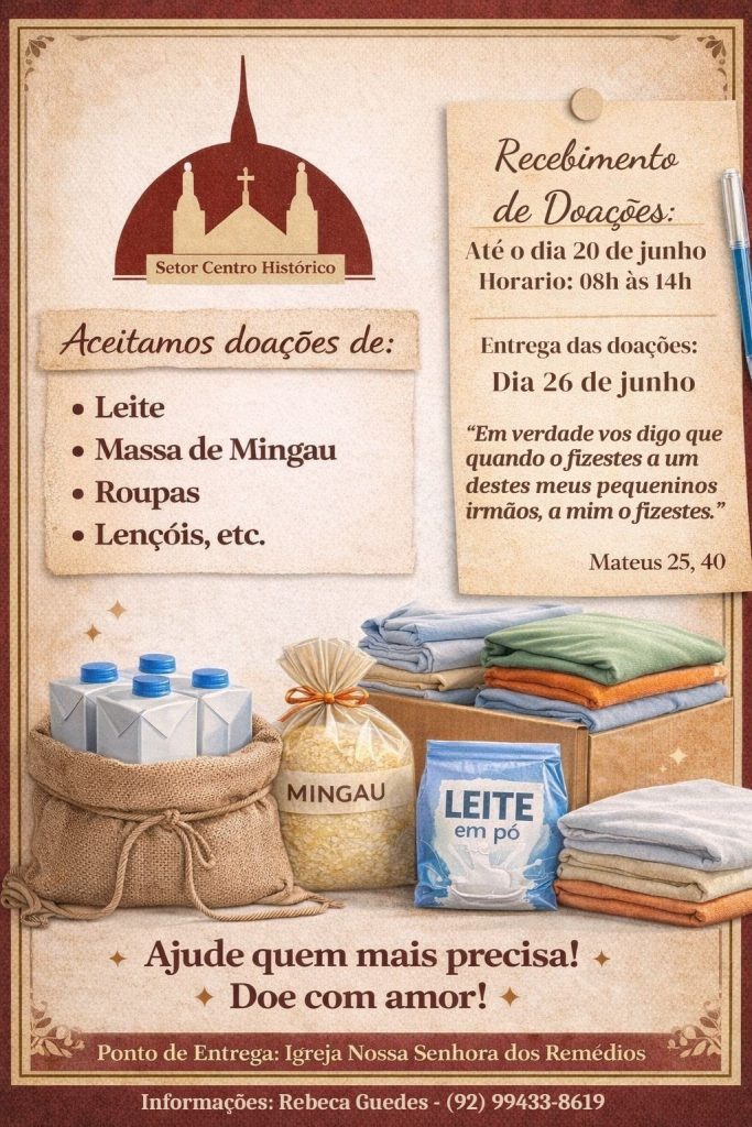 O Setor Centro Histórico iniciou uma campanha para arrecadar donativos para pessoas em situação de vulnerabilidade em Manaus. A ação recebe itens como leite, massa de mingau, roupas e lençóis até o dia 20 de junho. A proposta busca ajudar famílias e idosos que enfrentam dificuldades no dia a dia.