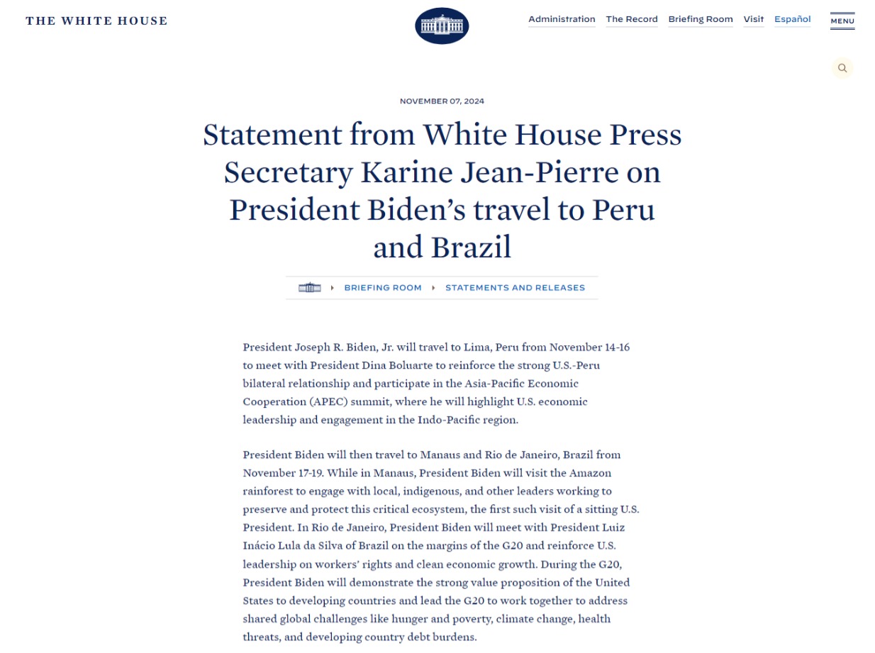 Conforme o comunicado oficial, “enquanto estiver em Manaus, o presidente Joe Biden visitará a floresta amazônica para se encontrar com líderes locais, indígenas e outros que trabalham para preservar e proteger esse ecossistema crítico”. A Casa Branca lembra ainda que essa é “a primeira visita desse tipo de um presidente dos EUA em exercício”.