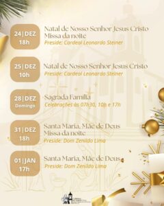 A Catedral Metropolitana de Manaus – Nossa Senhora da Conceição divulgou a programação especial das celebrações de fim e início de ano, que marcam momentos centrais da fé cristã, como o Natal do Senhor, a Festa da Sagrada Família, a Solenidade de Santa Maria, Mãe de Deus, e o Dia Mundial da Paz.