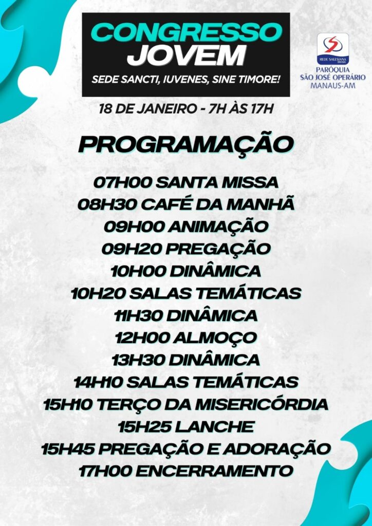 A Paróquia São José Operário, na Zona Leste de Manaus, realiza neste domingo, 18 de janeiro, a segunda edição do Congresso Jovem. O evento é voltado para jovens a partir de 14 anos e também está aberto a adultos que desejarem participar.