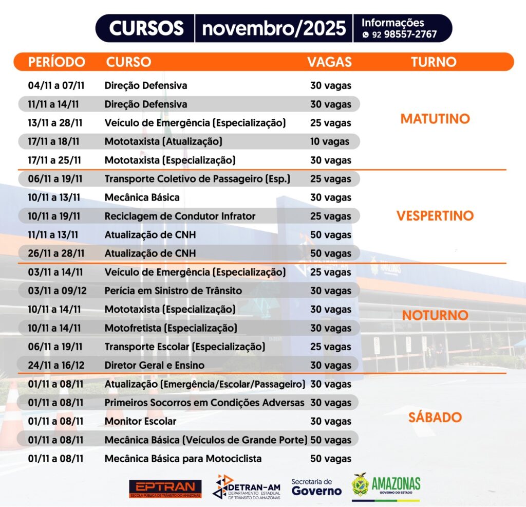 O Departamento Estadual de Trânsito do Amazonas (Detran-AM) vai abrir, no dia 21 de novembro, as inscrições para os cursos gratuitos que serão realizados durante o mês. Serão 665 vagas disponíveis, com turmas nos turnos manhã, tarde e noite, além de opções aos sábados.