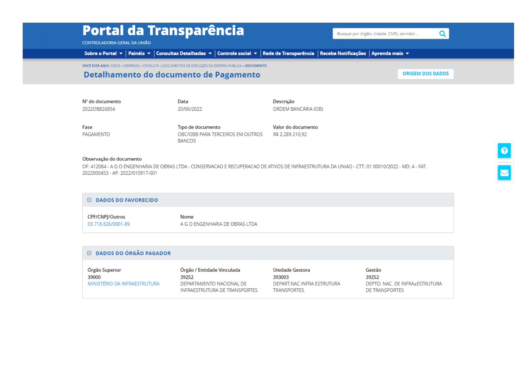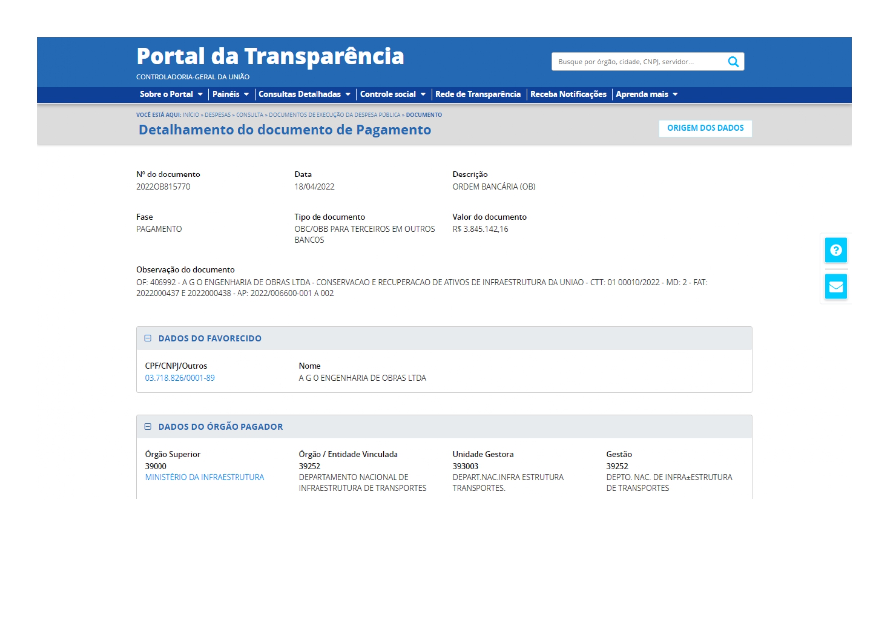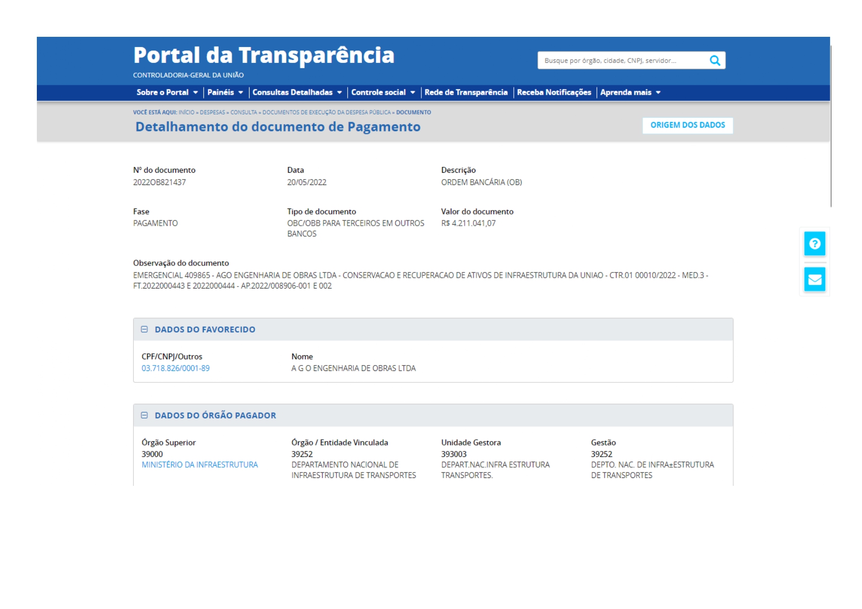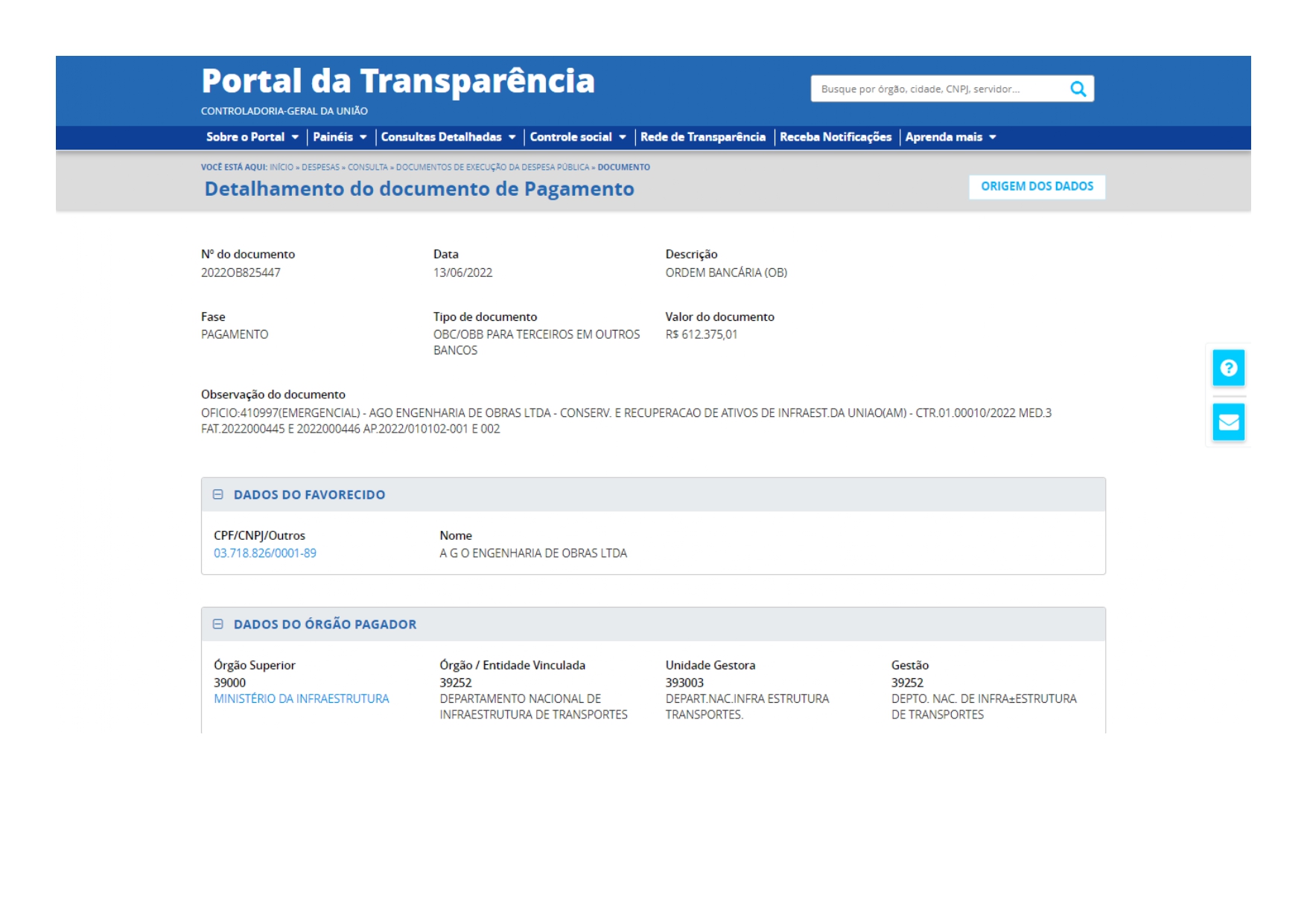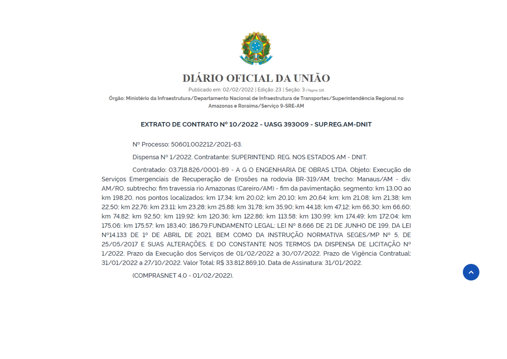Contudo, no dia 31 de janeiro deste ano, DNIT no Amazonas já tinha contratado a empresa A G O Engenharia de Obras, sem licitação, por mais de R$ 33,8 milhões, para recuperação de erosões entre os quilômetros 13 e 198 da BR-319. O contrato tem validade original até o dia 27 de outubro deste ano e a empresa já recebeu, segundo o Portal da Transparência do governo federal, mais de R$ 12,5 milhões. (Veja aqui o contrato e os repasses)