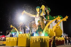 Abrindo a noite, o Grêmio Recreativo Escola de Samba Leões do Barão Açu apresentou o enredo “O Mundo Mágico dos Sonhos”, convidando o público a mergulhar em uma narrativa lúdica sobre magia e imaginação.