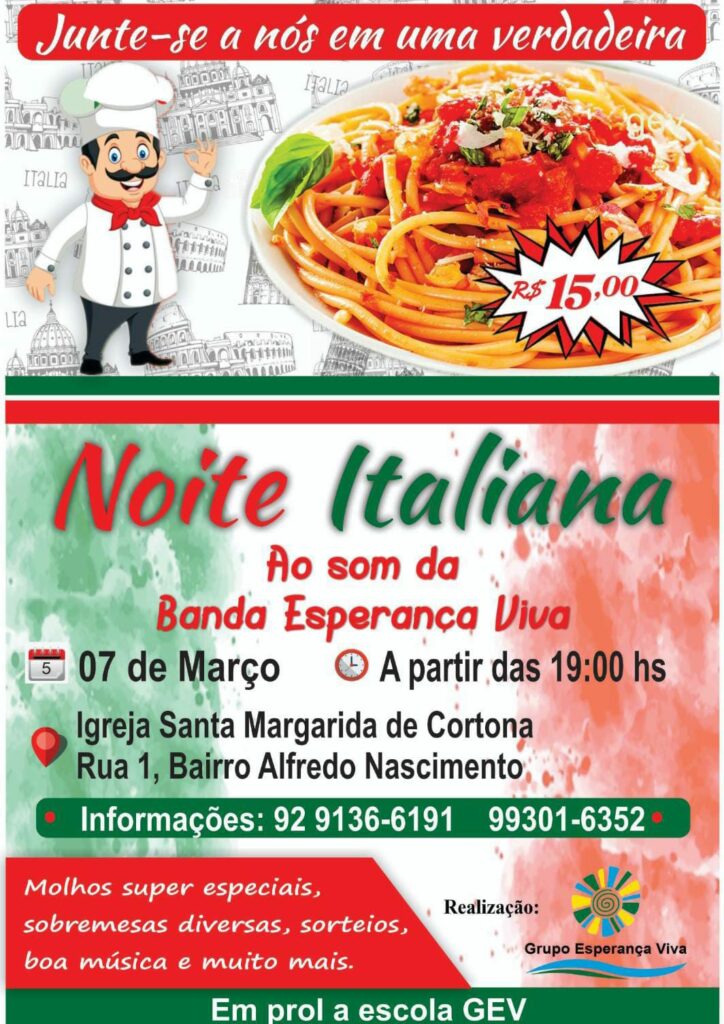 Para arrecadar recursos, o grupo organiza uma Noite Italiana. A renda será destinada à Escola GEV, encontro da Região Norte que ocorrerá de 4 a 8 de setembro, em Manaus, na unidade local da Fazenda da Esperança. O evento reunirá coordenadores e novos integrantes interessados no carisma do movimento.
