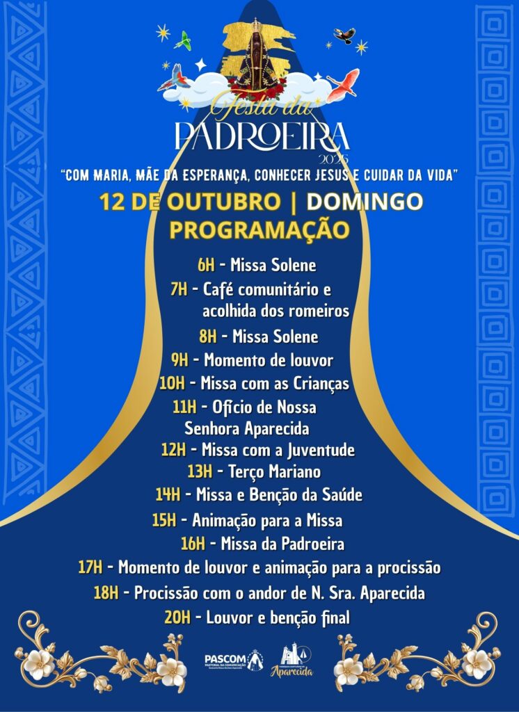A programação do dia 12 de outubro começa cedo, com a primeira Missa Solene às 6h, seguida por celebrações a cada duas horas. O ápice da festa será a Missa Solene da Padroeira, seguida pela grande procissão às 18h, um momento de profunda expressão de fé que mobiliza cerca de 400 voluntários e conta com o apoio de mais de 20 órgãos públicos.