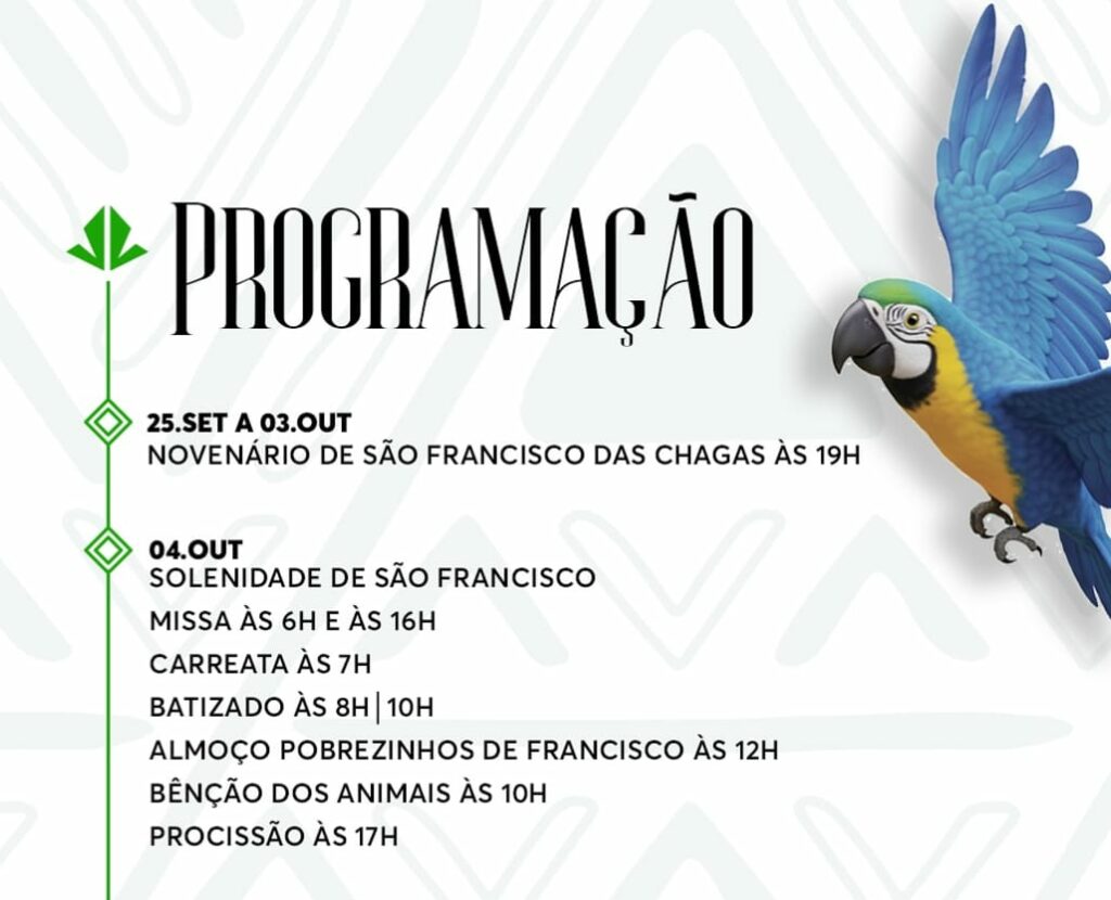 A Igreja Católica celebra neste sábado, 4 de outubro, a memória litúrgica de São Francisco de Assis, o santo patrono da Ecologia Integral. A festa, que acontece na paróquia dedicada a São Francisco das Chagas, na Colônia Oliveira Machado, convida os fiéis a vivenciarem uma intensa programação marcada pela fé, devoção e pela profunda conexão do santo com a natureza e todas as criaturas.