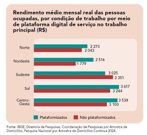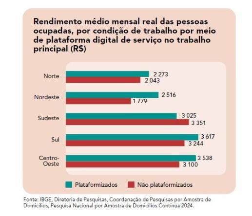 No total de pessoas, com 14 anos ou mais, ocupadas, no Norte do país, as que trabalham em plataformas digitais, representam um percentual de 1,9% da população. Entre 2022 e 2024, a variação foi de 0,7 ponto percentual, na Região Norte. Essa, é a maior variação entre as grandes regiões do Brasil. No Centro-Oeste, o aumento foi de 0,6 p.p., no mesmo período; no Nordeste, foi de 0,3 p.p; no Sudeste, de 0,2 p.p.; e no Sul, de 0,2 ponto percentual.
