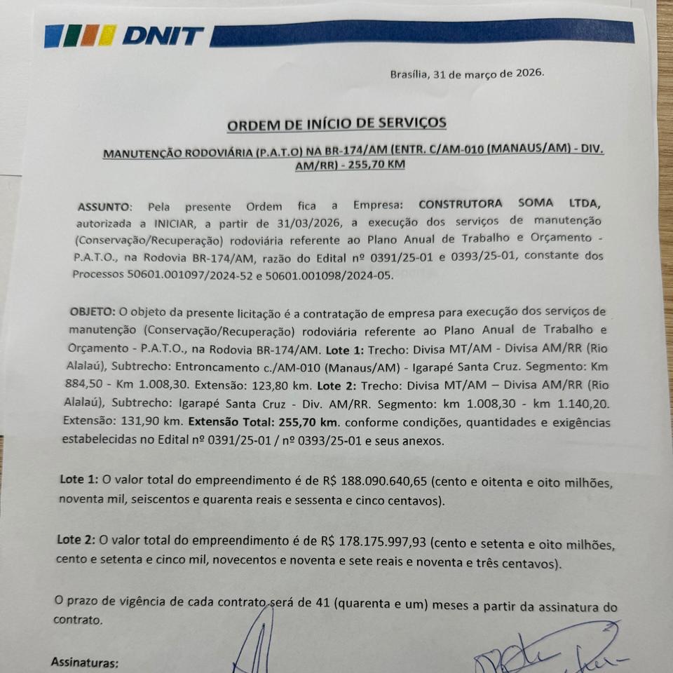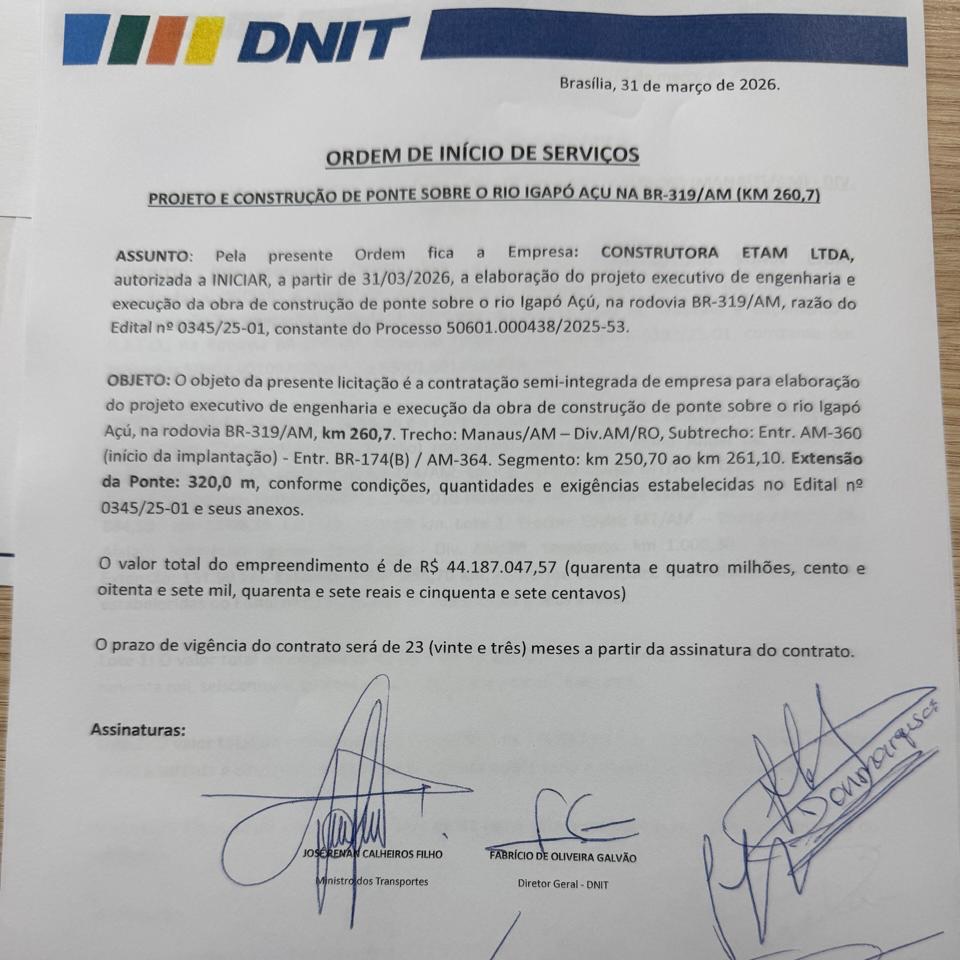 Uma delas é para construir uma ponte de 320 metros de extensão sobre o Rio Igapó-Açu, no quilômetro 260. O valor da obra é de R$ 44,2 milhões, com prazo de 23 meses para execução.