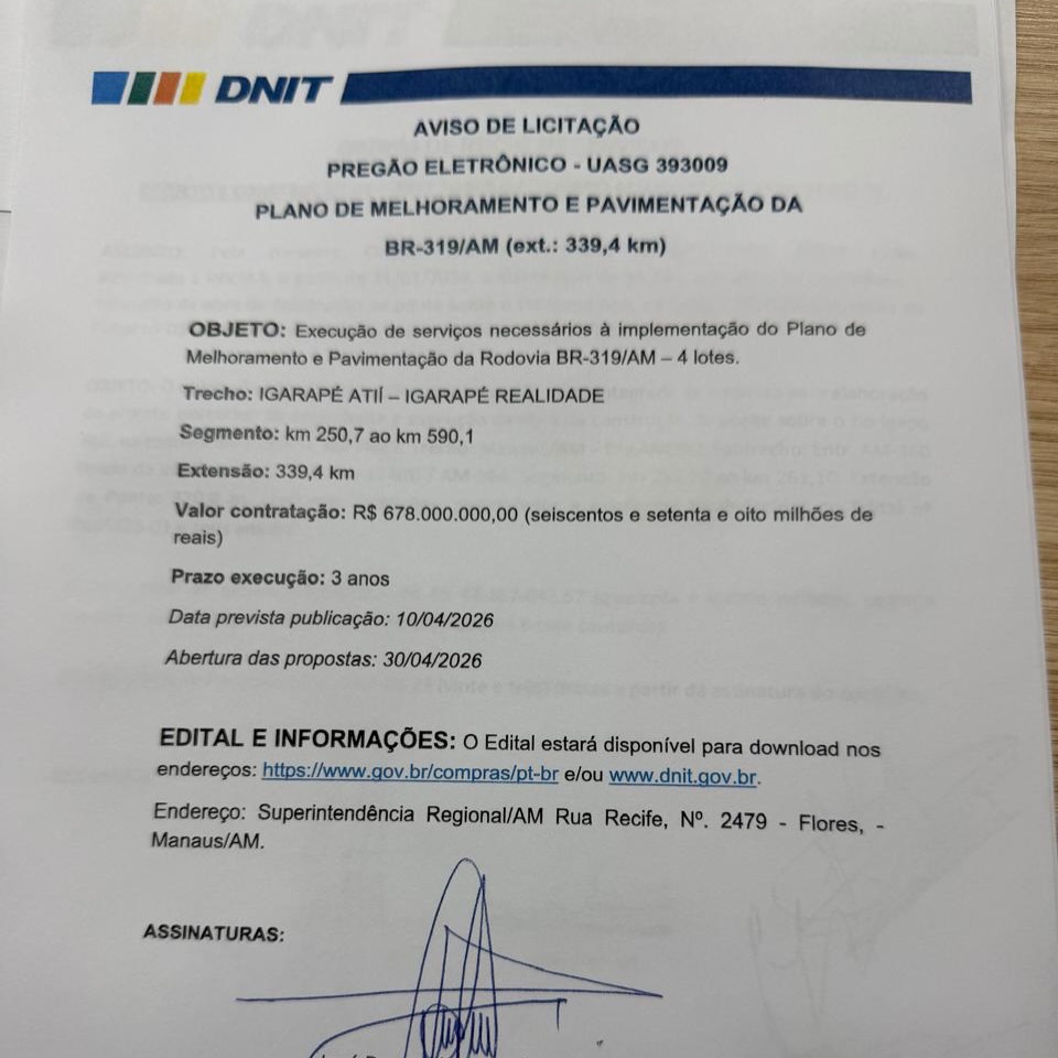 O governo federal vai publicar, no próximo dia 10 de abril, uma licitação de R$ 678 milhões para asfaltar, definitivamente, o chamado ‘trecho do meio’ da BR-319, que liga Manaus a Porto Velho. A afirmação é do ministro dos transportes, Renan Filho, que assinou o aviso de licitação, nesta terça-feira (31).