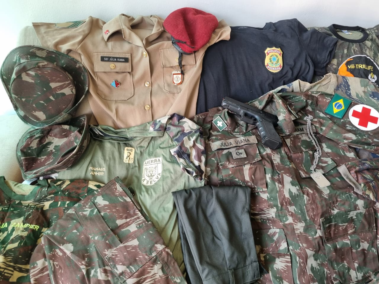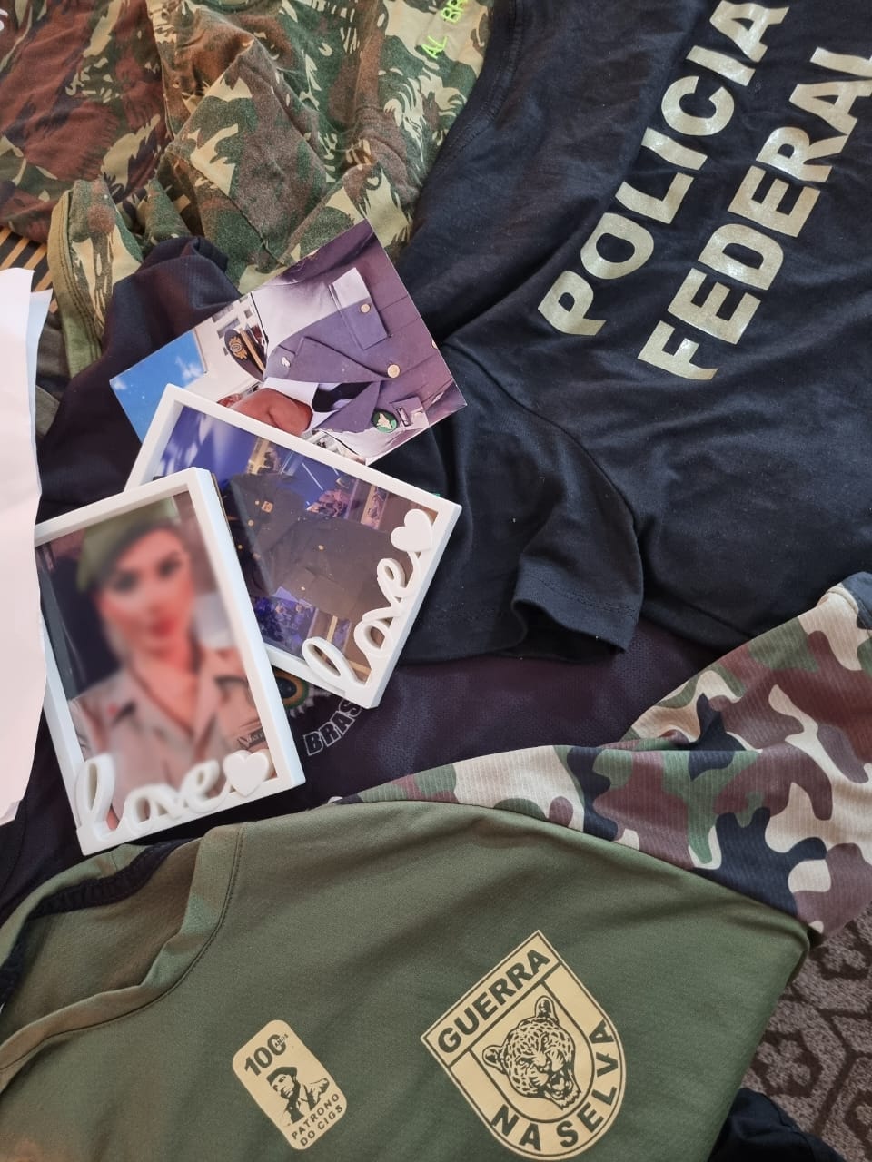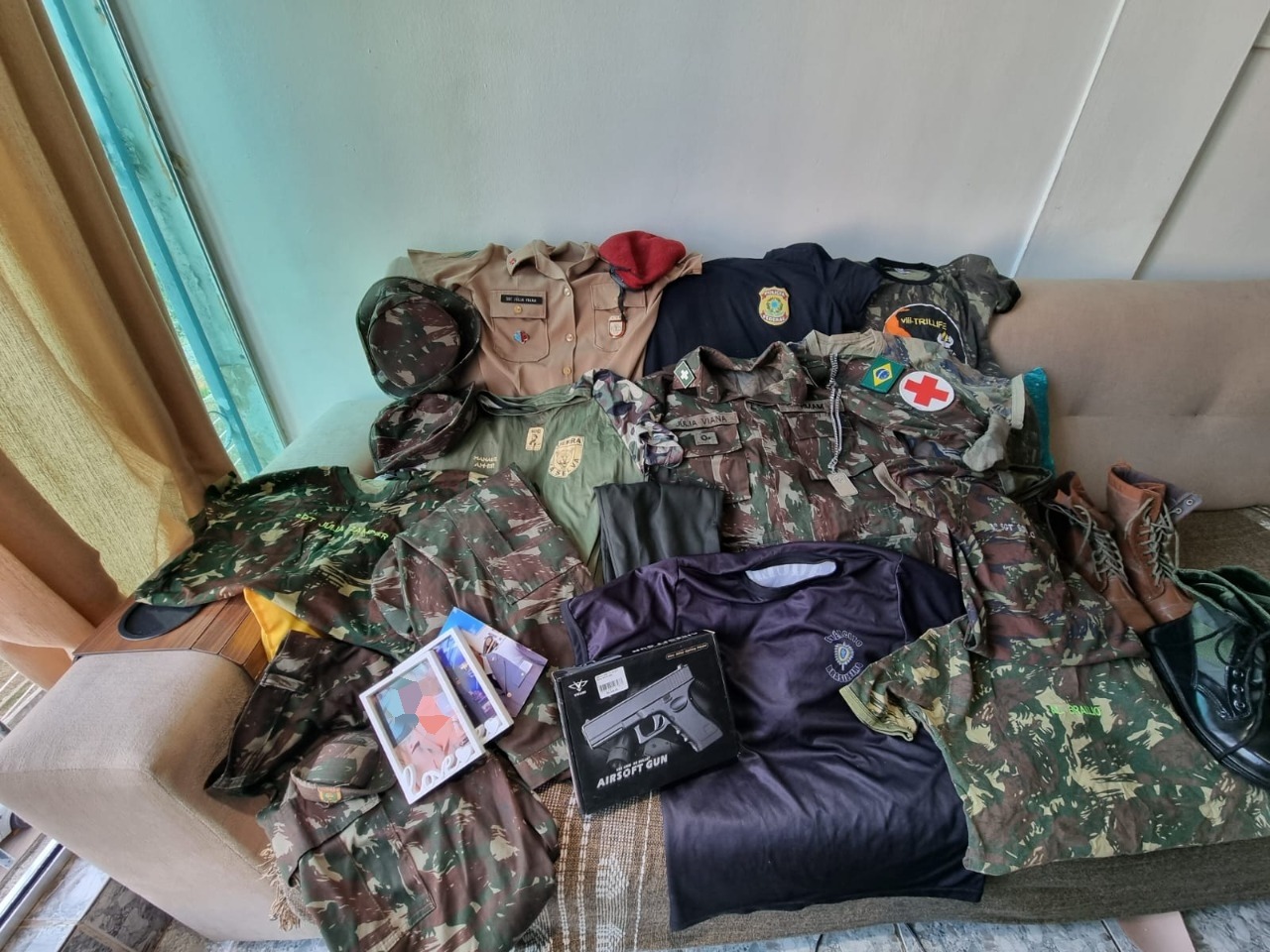 No local da busca foram encontrados diversos uniformes de diferentes forças de segurança pública, bordados com nomes falsos, broches oficiais, coturnos, um teste de gravidez falso e uma pistola airsoft.