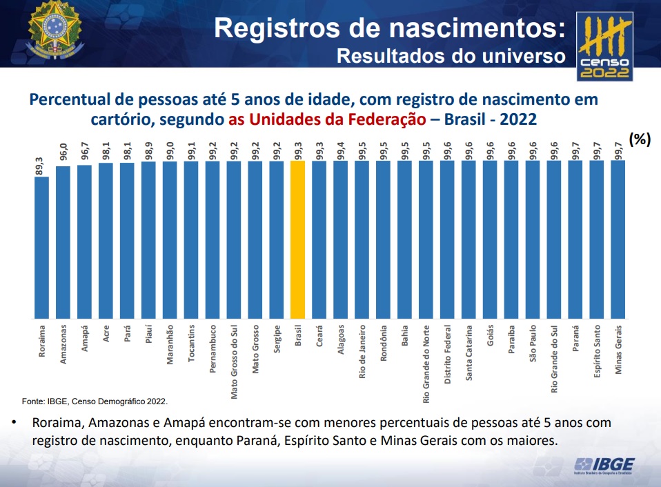 Conforme o resultado da pesquisa, o Amazonas só fica atrás de Roraima entre os estados com menores percentuais de registro de crianças de até 5 anos, com índice de 96%. Em Roraima são 89,3% e a média nacional brasileira é de 99,3%.