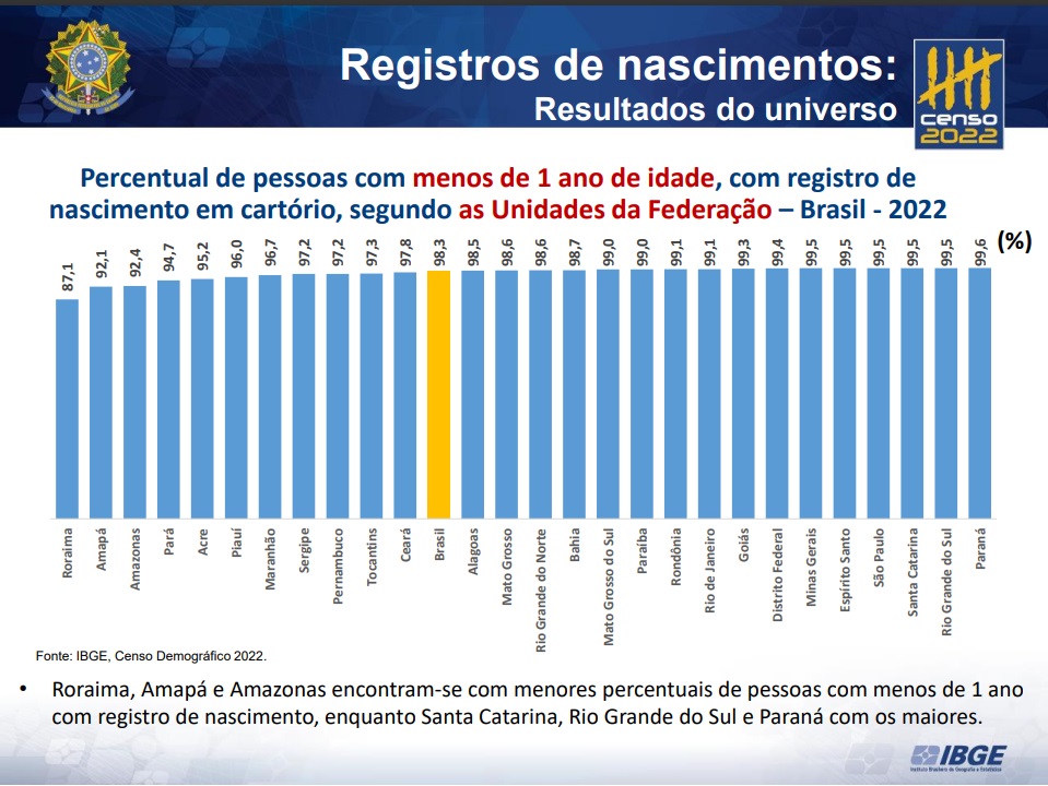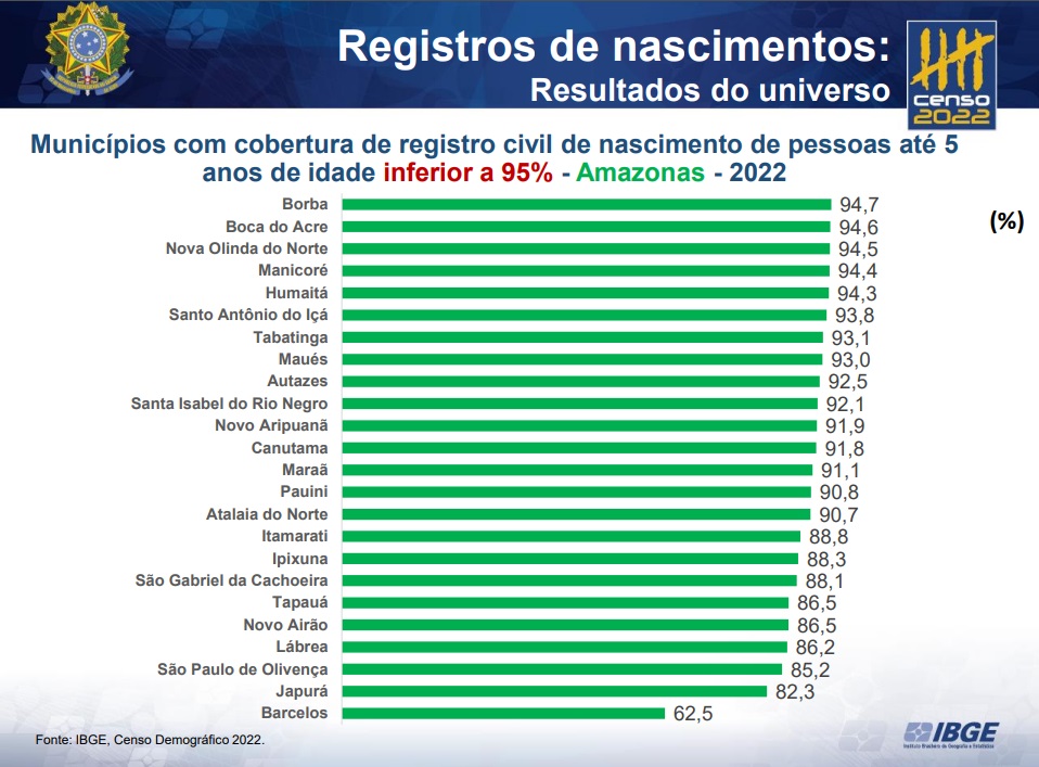 Em nenhum dos 62 municípios do Amazonas há registro de nascimento para 100% das crianças de até 5 anos de idade. A informação é do Instituto Brasileiro de Geografia e Estatística (IBGE), divulgou novas informações do Censo Demográfico 2022, na última quinta-feira (8), em Manaus.