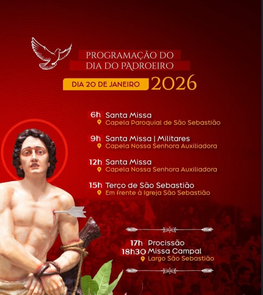 A Paróquia São Sebastião convida todos os fiéis e devotos a participarem do novenário até o dia 20 de janeiro. Inspirados pelo testemunho do padroeiro, a comunidade é chamada a permanecer firme na fé, unida na oração e fortalecida pela comunhão.
