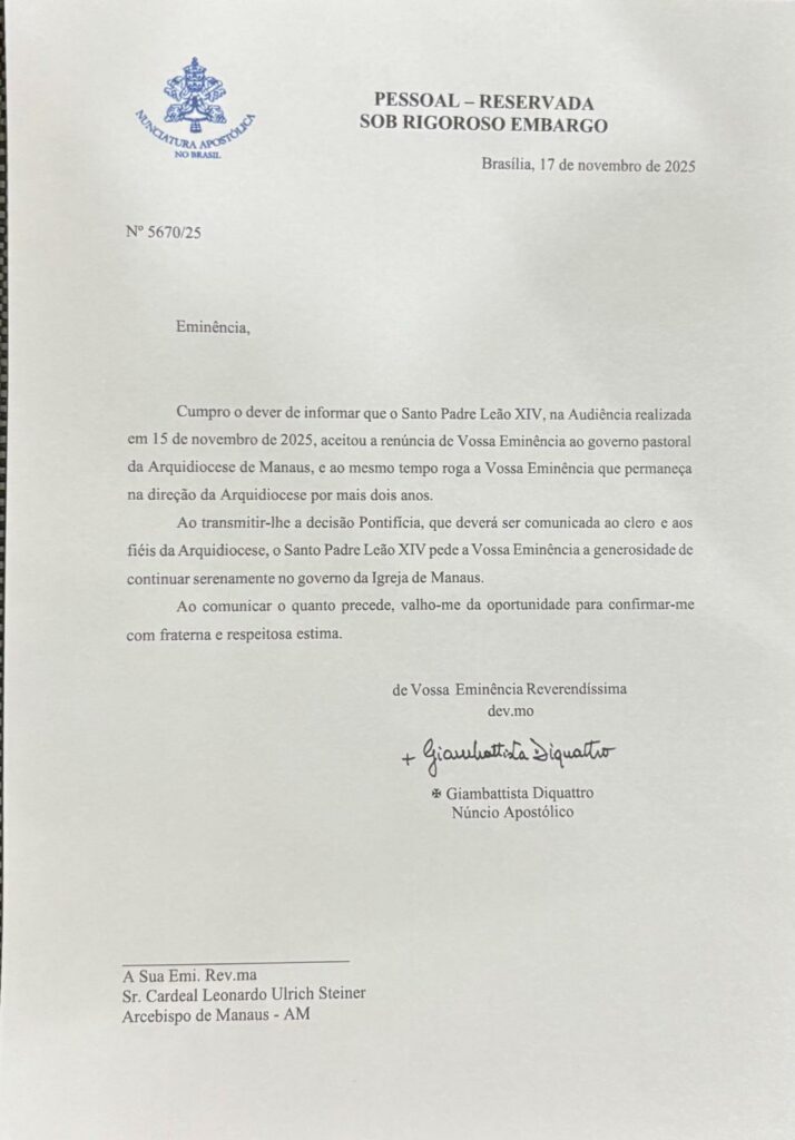 O núncio também pediu que a decisão seja informada aos padres e aos fiéis. Com isso, Steiner segue na liderança da Igreja em Manaus, garantindo continuidade aos projetos e atividades pastorais.
