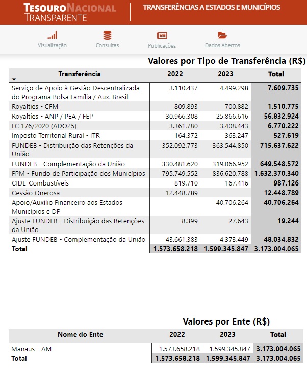 Contudo, o Portal da Transparência do Tesouro Nacional mostra que os repasses do governo federal para Manaus aumentaram R$ 26 milhões em 2023 na comparação com 2022. De acordo com a União, Manaus recebeu R$ 1,573 bilhão em 2022 e R$ 1,599 bilhão ao longo de 2023, em valores nominais.