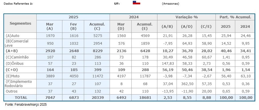 Conforme a Fenabrave, considerando todos os tipos de veículos, desde implementos agrícolas até ônibus, os emplacamentos totalizaram 20.339 unidades no primeiro trimestre do ano no Amazonas. O desempenho representa uma alta geral de 8,8% sobre o resultado de 18.681 emplacamentos do mesmo período do ano passado.